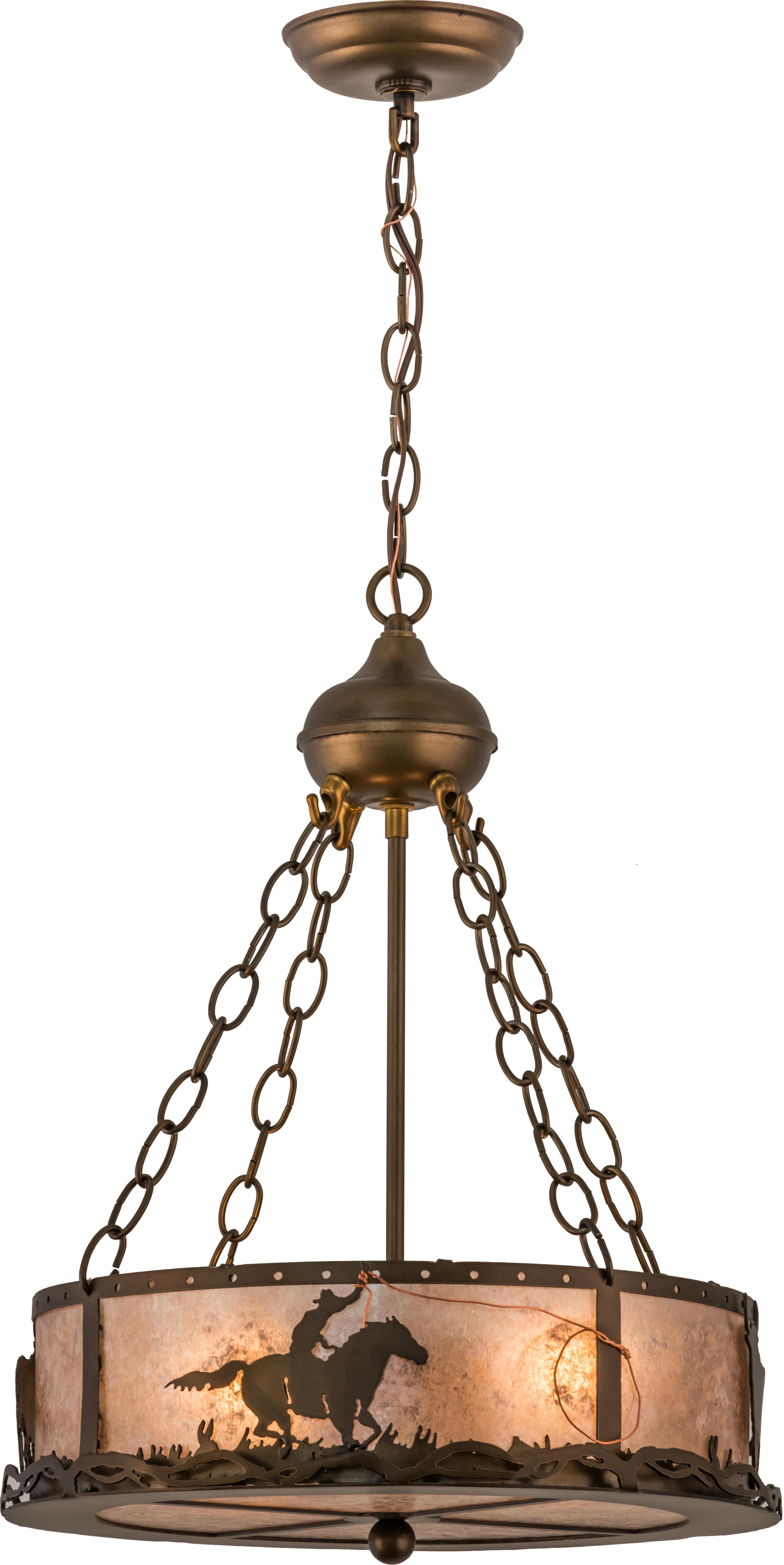 | A cowboy riding his trusty horse with a lasso in-handis depicted chasing steer across the prairie as thelate afternoon sun lowers in this western inspiredceiling fixture style. Warm ambient light projectsthrough impressive Silver Mica, which is complemented byaccents and hardware featured in an Antique Copperfinish. Handmade in the USA, this fixture ishandcrafted by Meyda artisans in our Yorkville, NewYork manufacturing facility. Custom colors, sizes andstyles are available, as well as dimmable energyefficient lamping options. Meyda Tiffany Inverted Pendant Bulb Type: MED Bulb Qty: 2 Bulb Wattage: 100 |