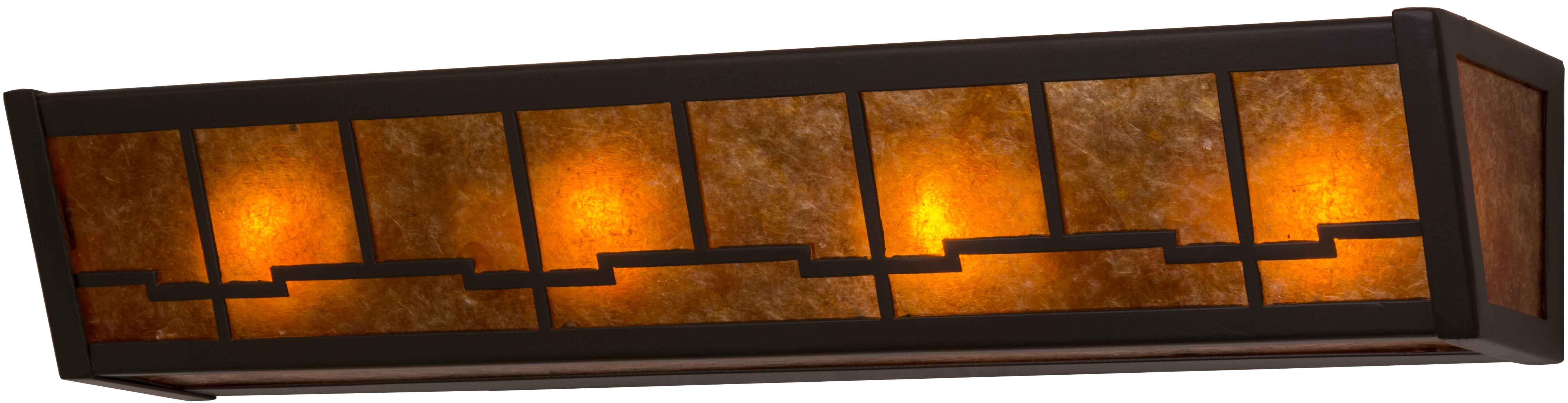 | This rectangular vanity light projects soft ambientlight through Amber Mica in a unique abstract style.The diffuser is complemented with a frame and hardwarefeatured in a enduring Bronze finish. This fixture,which can be used a vanity light for the bath or asconce for a hallway, is handcrafted in the Meydamanufacturing facility in Upstate New York. Customcolors, styles, sizes and dimmable energy-efficientlamping options are available. Meyda Tiffany Vanity Depth: 5.5 Bulb Type: MED Bulb Qty: 4 Bulb Wattage: 60 |