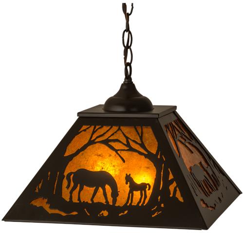 A charming image of a Mare and her Foal, grazing onthe grass while cradled by silhouettes woodland trees,features a impressive contrast of warm Amber Mica andstriking enduring Bronze finished steel accentsintegrated to illuminate the gorgeous effects of lightand shadow. The complex pose of the Mare, featuring aforeshortened body, twisting neck, and naturalisticallyplaced legs standing next to her adoring colt, isdeftly rendered in a matching metal finish. The pendantis handcrafted in the Meyda manufacturing facilitylocated at the foothills of the Adirondack Mountains.Additional wildlife and custom styles are available,as well as energy efficient lamping options.