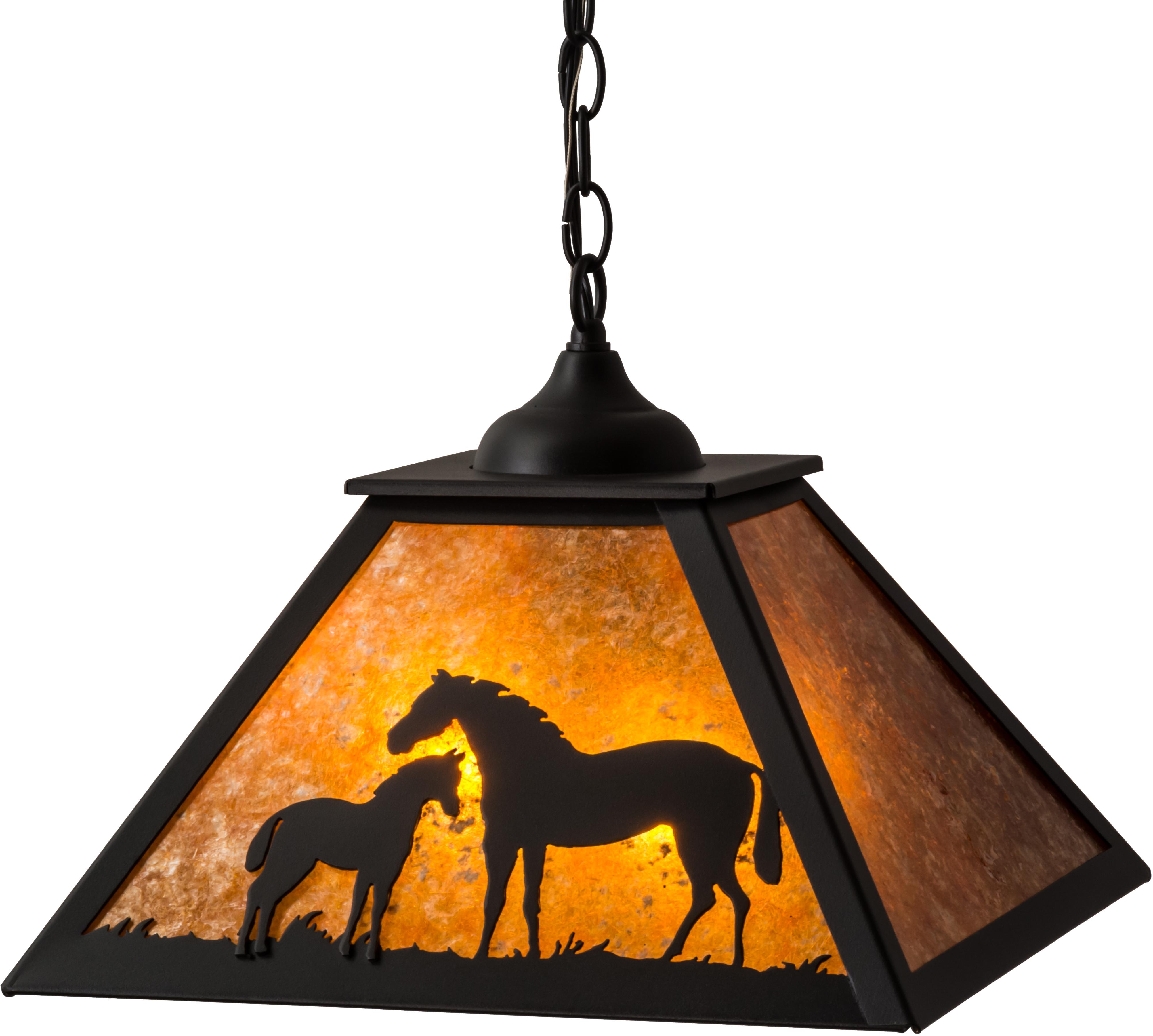| A charming image of a Mare and her Foal, standingtogether on the pasture, features a impressive contrastof warm Amber Mica and striking Black finished steelaccents integrated to illuminate the gorgeous effectsof light and shadow. The complex pose of the Mare,featuring a foreshortened body, twisting neck, andnaturalistic placed legs standing next to her adoringcolt, is deftly rendered in a matching metal finish.The pendant is handcrafted in the Meyda manufacturingfacility located at the foothills of the AdirondackMountains. Additional wildlife and custom styles areavailable, as well as energy efficient lamping options. Meyda Tiffany Pendant Bulb Type: MED Bulb Qty: 2 Bulb Wattage: 100 |