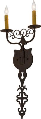 | grand hand-forged metalwork and a medallion styledbackplate make a rich, luxurious look for Merano.This high-styled wall fixture features two fauxcandlelights perched on bobeches and enhanced withscrolled accents featured in a Cajun Spice Texturedfinish. This sconce is ideal to complement a variety ofarchitectural styles for today's interiors. Customcrafted in the USA, this fixture is offered in customsizes, finishes and styles, as well as energy efficientlamping options. Meyda Tiffany Two Light Depth: 3.5 Bulb Type: CNDL Bulb Qty: 2 Bulb Wattage: 60 |
