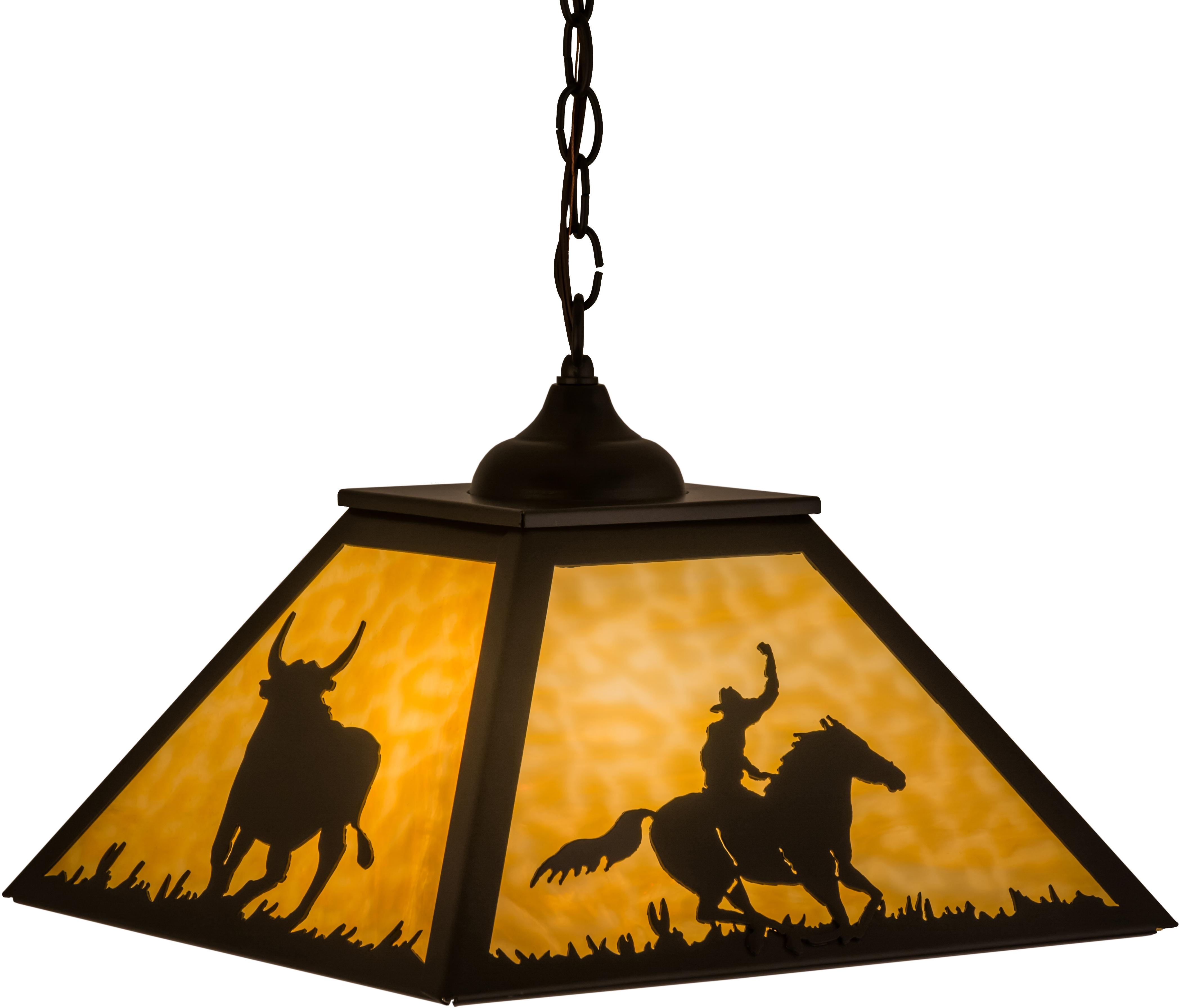 | A cowboy riding his trusty horse is depicted chasingsteer across the prairie as the sun shines brightly athigh noon in this western inspired ceiling fixturestyle. Warm ambient light projects through alluringBeige art glass, which is complemented by accents andhardware featured in a enduring Bronze finish. Handmadein the USA, this fixture is handcrafted by Meydaartisans in our manufacturing facility in the USA.Custom colors, sizes and styles are available, as wellas dimmable energy efficient lamping options. Meyda Tiffany Pendant Bulb Type: MED Bulb Qty: 2 Bulb Wattage: 100 |