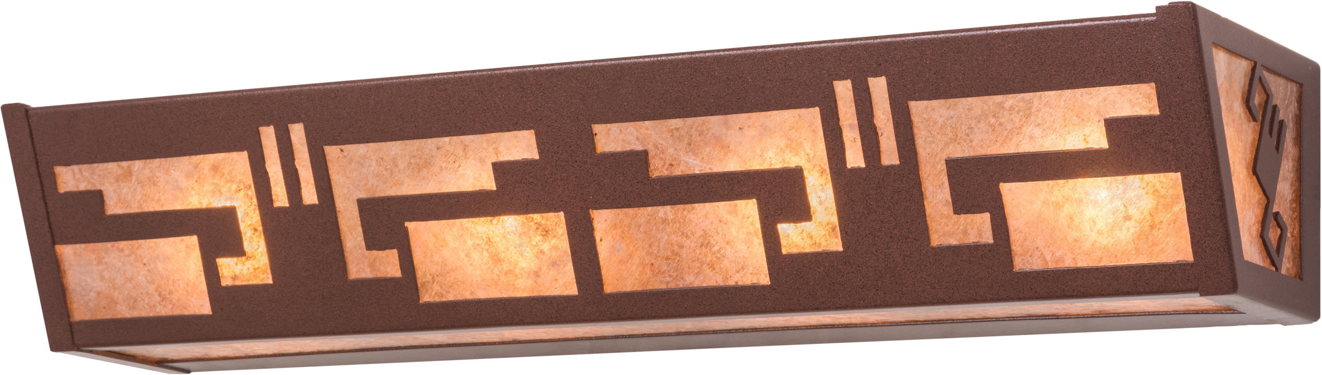 | A handsome Southwest style features a geometricstyle that arouses curiosity and intrigue on thiswall sconce. Warm ambient light evokes through SilverMica panels and is enhanced with Rust finished hardwareand frame. Made in the USA, this fixture is handcraftedby Meyda artisans in our Yorkville, New Yorkmanufacturing facility at the foothills of theAdirondack Mountains. Custom colors, sizes and stylesare available. Energy efficient lamping options areoffered. The fixture is UL and cUL listed for dry anddamp locations. Meyda Tiffany Vanity Depth: 5.5 Bulb Type: MED Bulb Qty: 4 Bulb Wattage: 60 |