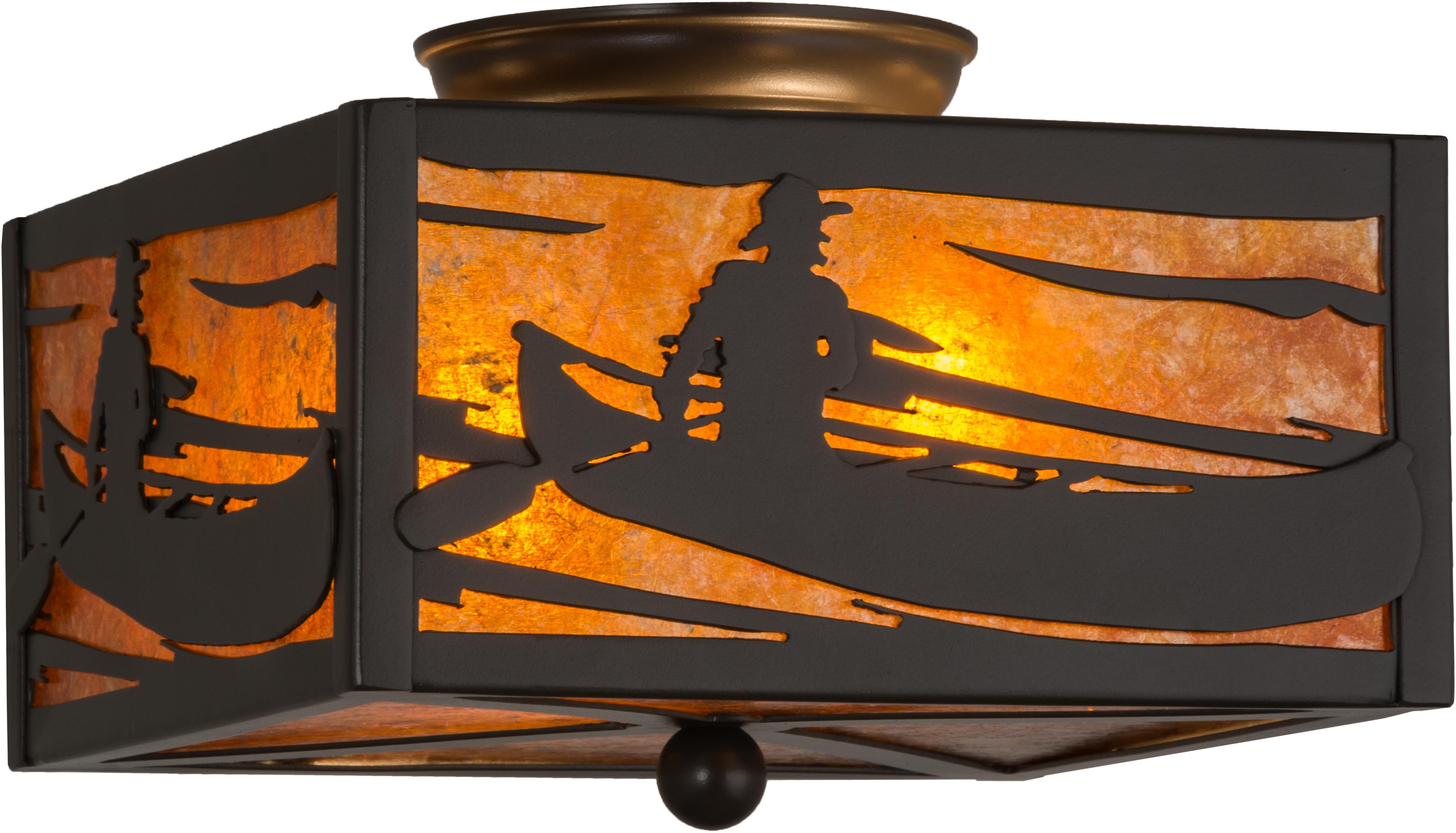 This nature inspired style depicts a sportsmanpaddling his canoe down a gentle mountain stream with agorgeous sunlit sky in the background. The fixture ishandcrafted with impressive Amber Mica, which is enhancedwith metal hardware and decorative accents that featurea warm enduring Bronze finish. Handcrafted in the USAby Meyda artisans at the foothills of Upstate NewYork's Adirondack Mountains, this flusciousmount is idealfor hallways, foyers and any room where you want tomake a charming rustic style look. Custom colors,styles and sizes are available, as well as dimmable,energy efficient lighting options. The fixture is ULand cUL listed for damp and dry locations.