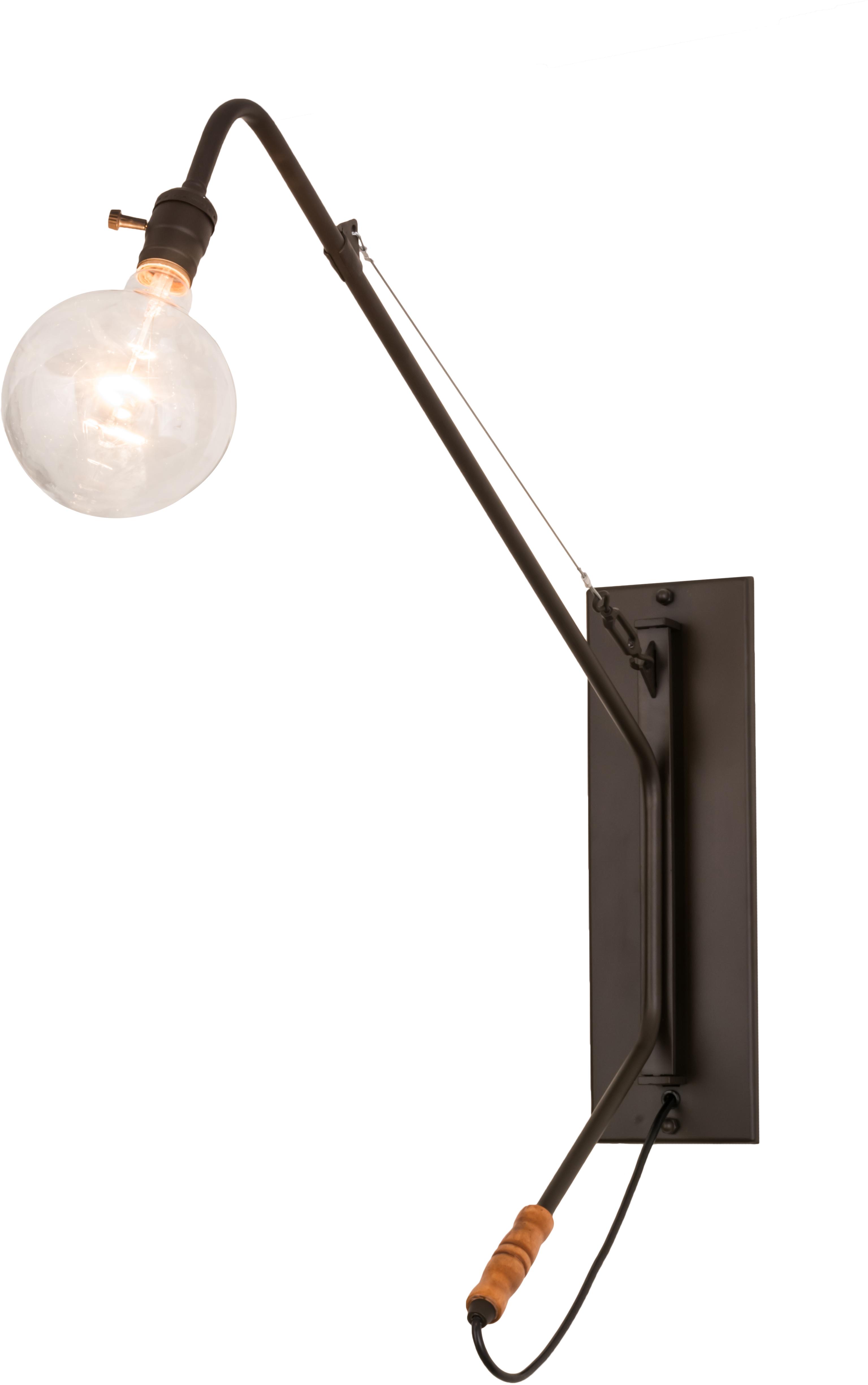 | styleed as a unique cantilever structure, Montadorfeatures a dramatic handle and an aircraft cablesupport for a distinguished aesthetic appeal. Offeredin a impressive Oil Rubbed Bronze finish, this wallluminaire accommodates oversized G40 lamps (notincluded). This fixture is ideal as a sconce in ahallway, breezeway and other rooms, or as a readinglight to deliver functional illumination. Handcraftedin the USA, this fixture is available in customstyles, colors and sizes, as well as dimmable energyefficient lamping. UL and cUL listed for damp and drylocations. This fixture can be styleed as a swingarmsconce- call for details. Meyda Tiffany One Light Depth: 29.5 Bulb Type: MED Bulb Qty: 1 Bulb Wattage: 60 |