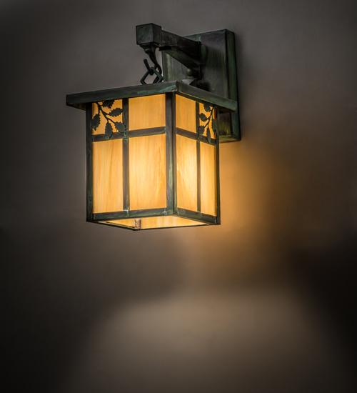 | Custom crafted of Solid Brass, delicate sprays ofleaves featured in a impressive Verdigris finish adornBeige Iridescent art glass, which is complemented withhardware and a frame featured in a matching Verdigrisfinish. This Craftsman Signature fixture is perfect forindoor and outdoor lighting applications andhandcrafted by Meyda artisans in the Yorkville, NYmanufacturing facility at the foothills of the gloriousAdirondack Mountains.Custom colors, styles and sizesare available. Energy efficient lamping options areoffered. The fixture is UL and cUL listed for damp, dryand wet locations. Meyda Tiffany One Light Depth: 9 Bulb Type: MED Bulb Qty: 1 Bulb Wattage: 60 |