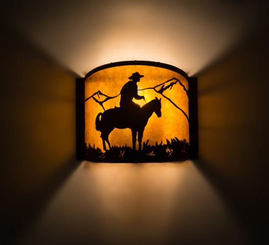 A lone cowboy rides his trusty horse along themountainside as the afternoon sun shines brilliantly inthis western inspired wall fixture style. gorgeousambient light projects through impressive Amber Mica,which is complemented by a frame and decorative accentsfeatured in a Mahogany Bronze finish.Made in the USA,this fixture is handcrafted by Meyda artisans in ourmanufacturing facility at the foothills of theAdirondack Mountains.Custom colors, sizes and stylesare available.Dimmable energy efficient options arealso offered. The fixture is UL and cUL listed for dampand dry locations.