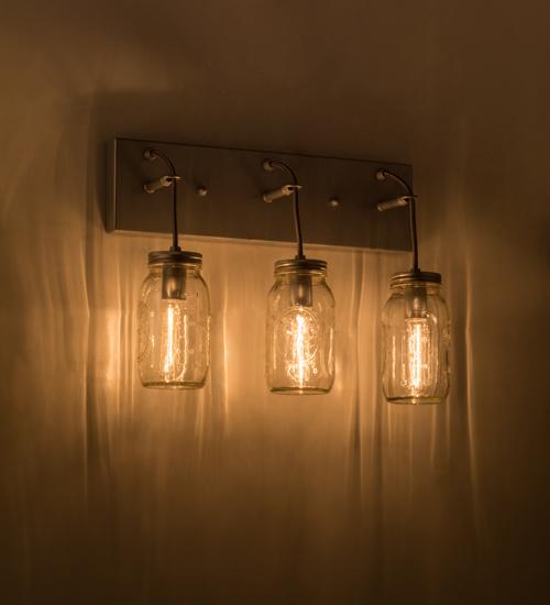 | styleed to add quaint charm and fun to your home orbusiness, this pendant features three Clear Glass MasonJars with Sparkle Silver finished hardware that willcomplement a broad range of interior d‚corschemes.Place the fixture as a vanity light in a bathor as a sconce in hallways and other rooms. Made in theUSA, the fixture is handcrafted by highly skilled Meydaartisans in the Yorkville, New York manufacturingfacilities. Custom styles, colors, sizes and dimmableenergy efficient lamping options are available. Thewall fixture is UL and cUL listed for damp and drylocations. Meyda Tiffany Vanity Depth: 6 Bulb Type: INTM Bulb Qty: 3 Bulb Wattage: 40 |