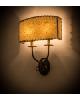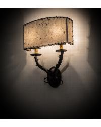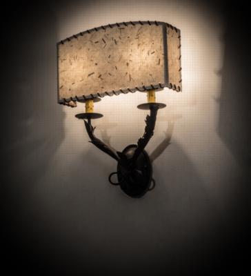 | Evoking an intriguing western look, this wall fixturefeatures a Grass Paper shade wrapped with authenticRawhide accents. The shade conceals two fauxcandlelights perched on bobeches with decorative armsand hardware featured in a Wrought Iron finish.Handcrafted in the USA, this sconce is available incustom sizes, styles, colors and dimmable energyefficient lamping. The fixture is UL and cUL listed. Meyda Tiffany One Light Depth: 4.5 Bulb Type: CNDL Bulb Qty: 2 Bulb Wattage: 25 |