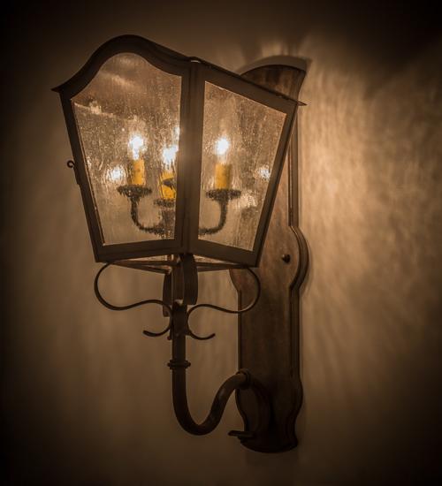 | A strikingly handsome and distinctive style capturesthe distinctive qualities of this lantern and theimpressive luster of appealing metal hardware. ClearSeeded glass projects ambient light through thislantern, which is complemented with a curved frame,scrolled accents and hardware featured in a Cajun SpiceTextured finish. Custom options, including specialsizes, styles, finishes and dimmable energy efficientlamping, are available. The sconce, which ishandcrafted in the USA, is UL and cUL listed. Meyda Tiffany One Light Depth: 14.5 Bulb Type: CNDL Bulb Qty: 4 Bulb Wattage: 60 |