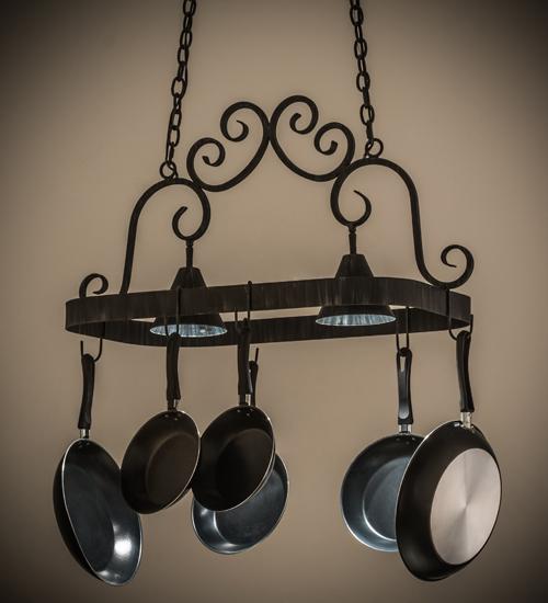 | An upscale style that integrates form and function,Elana is highlighted with large scroll accents and anAntique Iron Gate finished frame with hooks to displayfine cookware for easy access in kitchens. Twoluminaires provide optimal downlighting to illuminatecounter surfaces, tabletops, islands and architecturalaccents. Handcrafted in the USA by our highly skilledartisans, this fixture is available in custom sizes,styles, colors and energy-efficient lamping options. ULand cUL listed for damp and dry locations. Meyda Tiffany Pot Rack Depth: 18 Bulb Type: MED Bulb Qty: 2 Bulb Wattage: 40 |