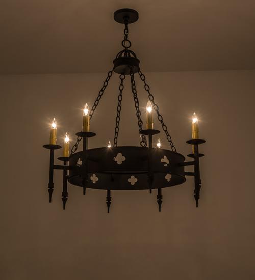 | Underscored with Quatrefoil styles representative ofa historical architectural icon dating back to theRenaissance era, this rich distinguished stylehighlights the borders of this chandelier. Sabrinafeatures a central structure adorned with eight fauxcandlelights, complemented with decorative accents andhardware featured in a Black Textured finish. Each ofthe luminaires is perched on bobeches with Gothicstyled arms. Handcrafted in the USA, this chandelier isavailable in custom styles, colors, sizes and dimmableenergy efficient lamping. The fixture is UL and cULlisted for damp and dry locations. Meyda Tiffany Chandelier Bulb Type: MED Bulb Qty: 8 Bulb Wattage: 60 |