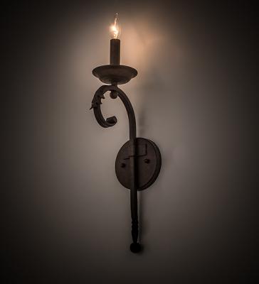 | Rich, handsome styling greets a distinctivesophisticated look. A faux candlelight is perched atopof a custom tailored bobeche, which is accented with acurved decorative stem embellished with an Ancanthusleaf and ball point accent for a high level ofaesthetic appeal. impressive Solid Steel hardware is handforged and hand finished in a Cajun Spiece hue. Idealfor hallways, foyers and other rooms in homes,restaurants, pubs, hotels and other fine interiors, thefixture is custom crafted by our artisans in ourmanufacturing facility in Yorkville, New York.Customsizes, styles, colors and dimmable energy efficientlamping options are available. The fixture is UL andcUL listed for damp and dry locations. Meyda Tiffany One Light Depth: 7 Bulb Type: CNDL Bulb Qty: 1 Bulb Wattage: 60 |