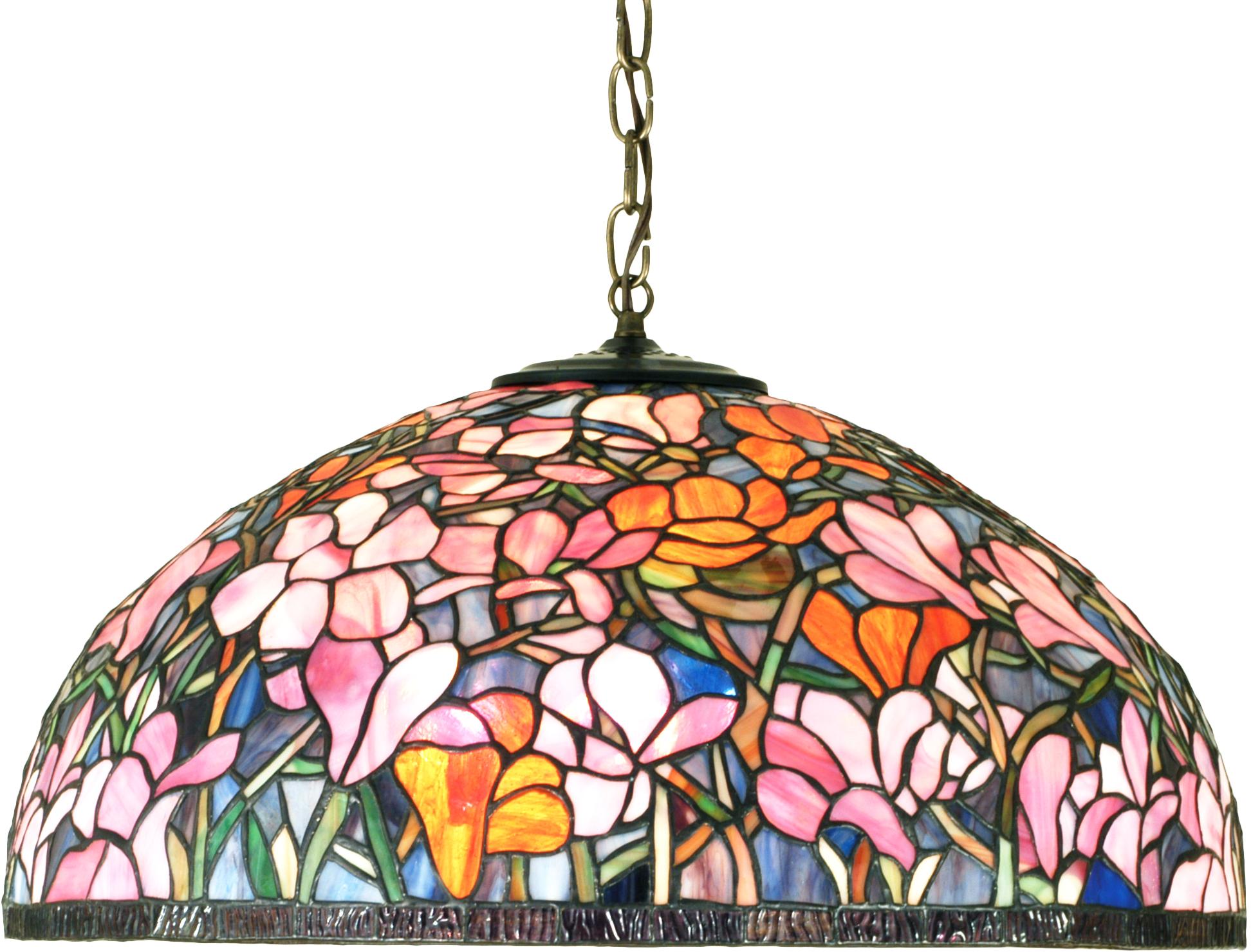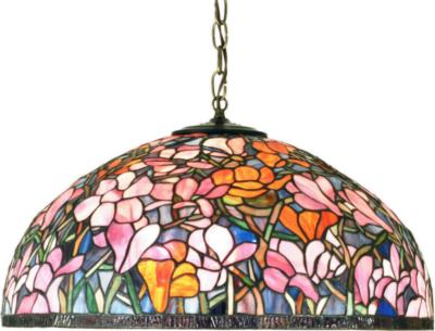Banded in glistening granite textured Multi-Huedglass, this Louis Comfort Tiffany's Magnoliareproduction is a classic representation of themaster's artistry. Plum Pink blossoms mingle withSunset Apricot blossoms against a Dusky Azure sky. Thisstained glass pendant is complemented with coordinatinghardware in a Mahogany bronze finish.