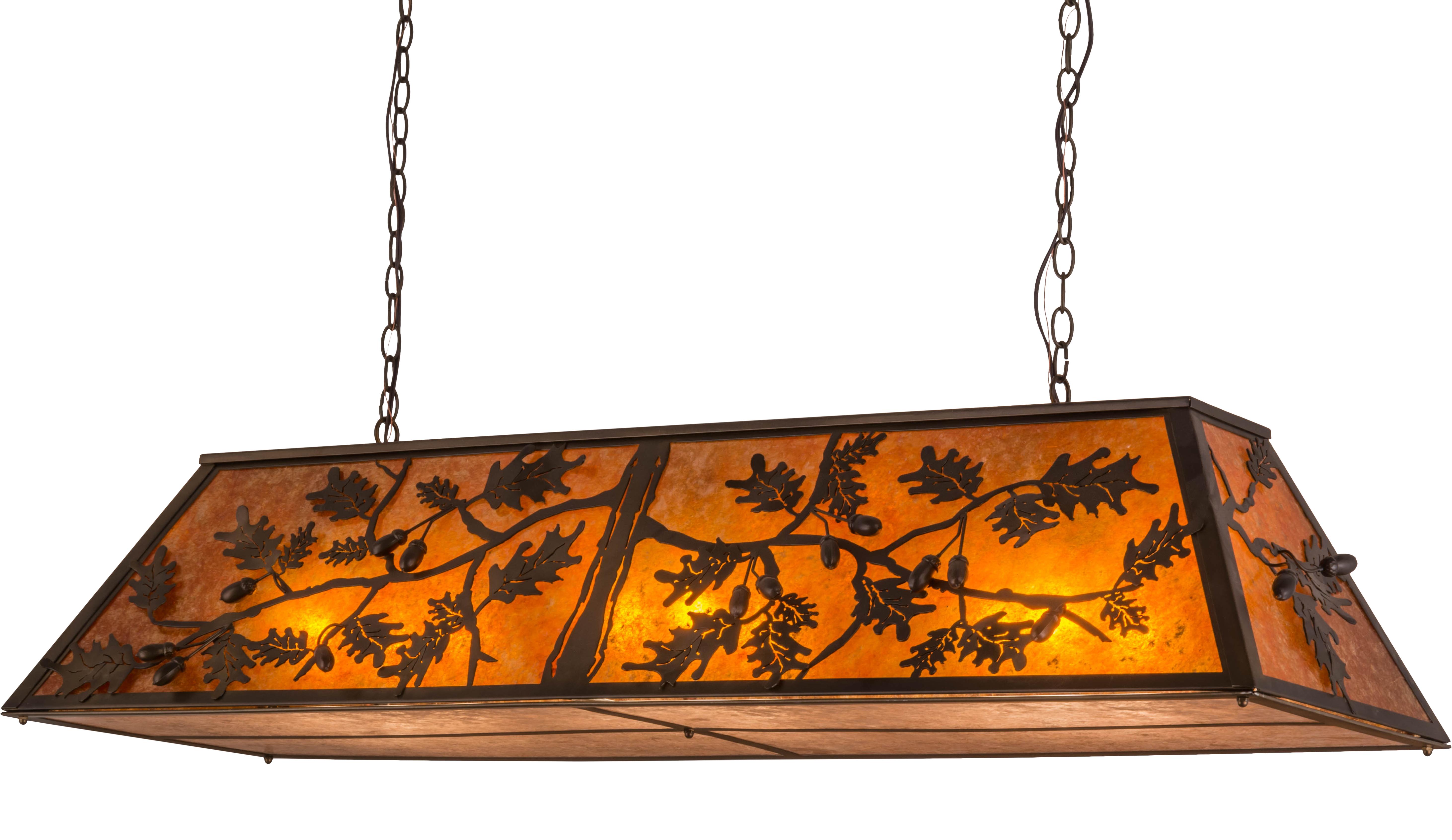 | Rustic charm is revealed with this nature inspiredlighting style as impressive Oak leaves flourish frombranches that adorn the Amber Mica side panels and theSilver Mica bottom diffuser. The shade is complementedwith accents and hardware featured in an Antique Copperfinish. The most powerful of all trees, the mighty Oakrepresents courage and strength. This oblong pendant isperfect for illuminating kitchen islands, counters,dining tables and other areas. The fixture ishandcrafted in our facility at the foothills of theAdirondack Mountains in the US. Dimmable energyefficient lamping options, as well as custom sizes,styles and colors, are available. The fixture is UL andcUL listed. Meyda Tiffany Billiard/island Depth: 18 Bulb Type: MED Bulb Qty: 9 Bulb Wattage: 60 |