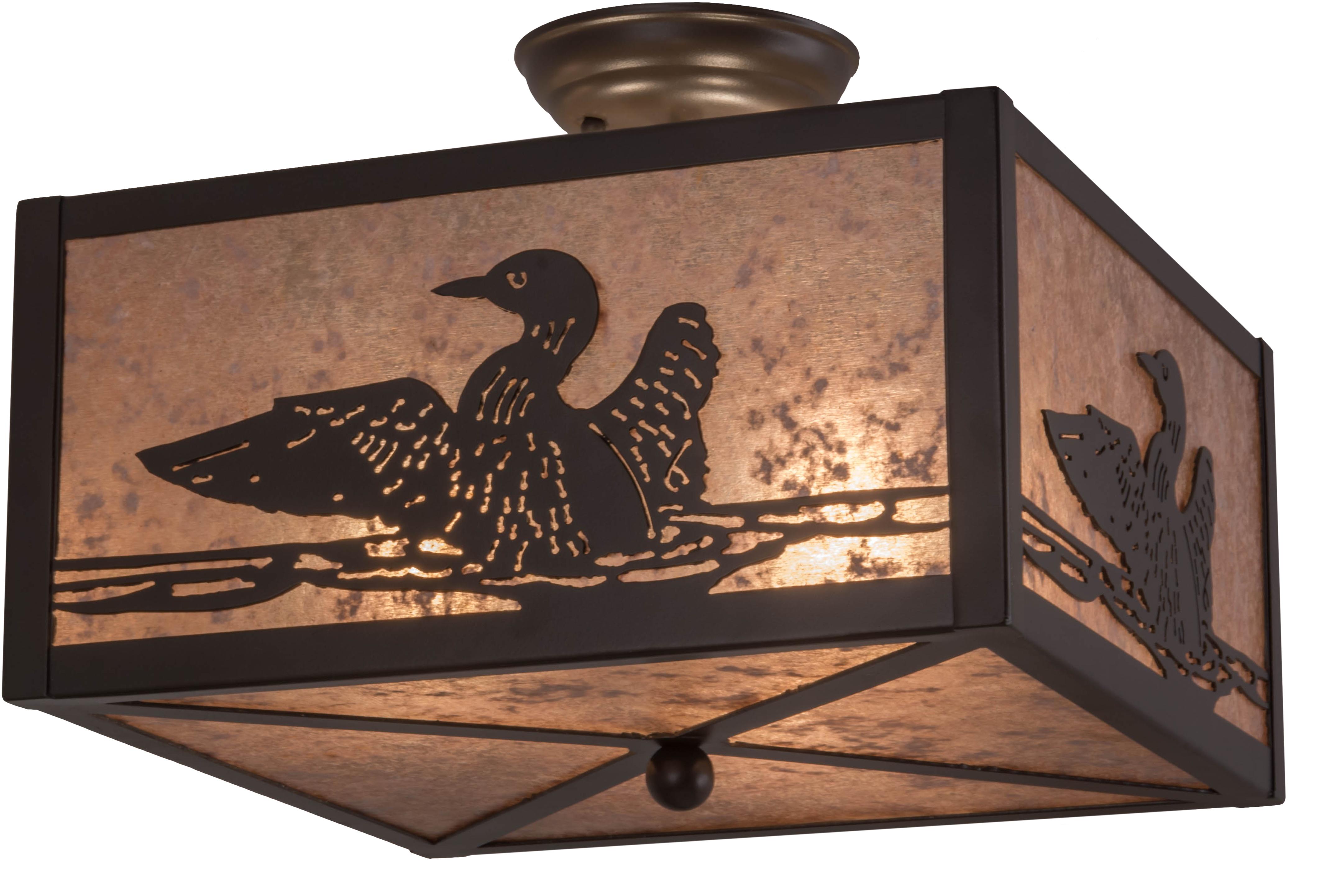 | Listen to the eerie calls of the Loon echo acrossclear lakes of the wilderness. This charming wildlifestyle captures a Loon swimming across a country lake.The decorative accents and hardware are highlighted ina enduring Bronze finish on an alluring Silver Micashade. This nature inspired fixture is handcrafted byMeyda artisans in our manufacturing facility at thefoothills of New York's Adirondack Mountains. Customoptions include various sizes, styles, colors anddimmable energy efficient lamping. The fixture is ULand cUL listed. Meyda Tiffany Fluscious Mount Bulb Type: MED Bulb Qty: 3 Bulb Wattage: 60 |
