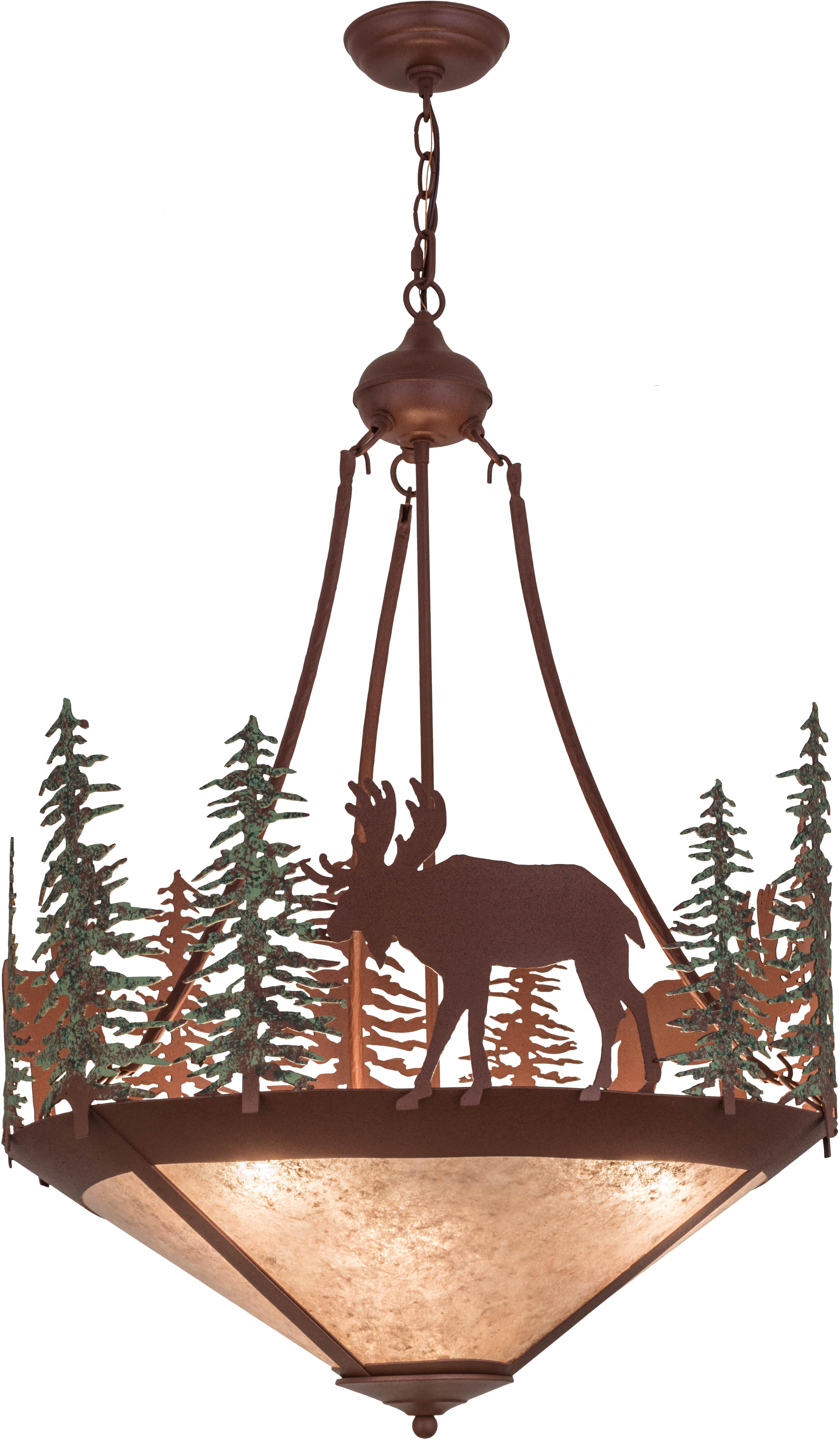| This handsome inverted pendant features Green finishedpine trees with Rust finished Moose on a Rust finishedfixture. The fixture is hand made in the U.S.A. byMeyda craftsman and has Silver Mica panels. Meyda Tiffany Inverted Pendant Bulb Type: MED Bulb Qty: 3 Bulb Wattage: 60 |
