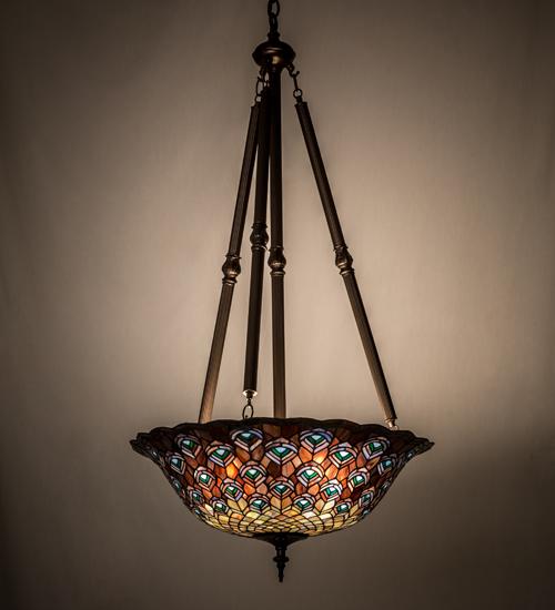 One of Louis Tiffany's favorite styles, the peacockfeather is gorgeously reproduced in handcraftedcopperfoil construction by Meyda Tiffany craftsmen. Acrest of Multi Hued scallops, top a ring of spectacularTeal and Amethyst plumage. The exquisitely flared andundulating stained glass shade is paired with MahoganyBronze hand applied finished hardware in this one of akind inverted pendant fixture.
