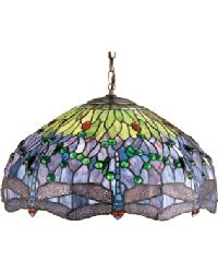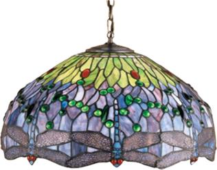 | Hanginghead Dragonfly Pendant 12"H x 22"W Holds (3) 60W Bulbs Canopy and 3" of chain included Free Shipping on Tiffany Style Lamps This version of Tiffany Studio's most beloved stained glass dragonfly design, is modeled after the original hanging head dragonfly. Diving dragonflies with glowing Scarlet jeweled eyes and delicate metal filigree wings circle over hand cut and copper foiled pieces of Amber streaked, Pond Green and dusky sky Blue Violet art glass accented with glistening jewels of Sea Green and Amber, representing an early evening sky reflecting on rippling water The pendant hardware is finished in a warm hand applied mahogany bronze. |
