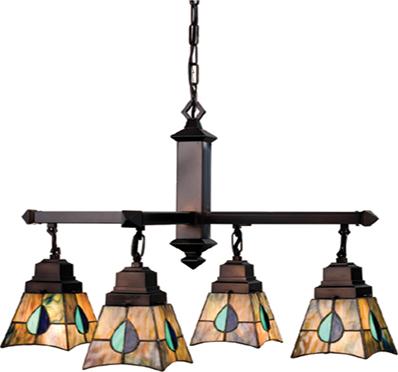 | Leaf Four Light Chandelier Total Height: 27-61" Total Width: 26" Shade: 5"H x 5"Sq Bulb: Reg x4 Max Watt: 60 x4 Canopy & 3' of chain included. Free Shipping on Tiffany Style Lamps The four arm Mackintosh Leaf stained glass chandelier has Tiffany style shades in a striking leaf design of Heather, Purple, Highland Teal and Peacock Feather Green glass. The chandelier was inspired by a famous design from Scottish Nouveau Artist Charles Rennie Mackintosh. It features a Mahogany Bronze finish. |