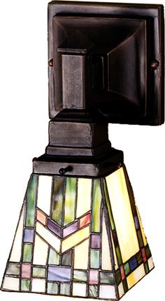 | In the tradition of the Prairie School, organic objects were interpreted into geometric forms. In this wall sconce, Meyda Tiffany uses colorful interlocking blocks of Willow Green, Chili Red and Azure Blue to form stylized wheat stalks on a Beige Cream background. The handcrafted stained glass shade is suspended from Mahogany Bronze hand finished hardware. |