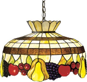 A Meyda Tiffany original classic stained glass design. This delightful basket of ripe luscious three dimensional fruit, Golden pears; Ruby Red cherries; Crimson apples and Amethyst grape clusters, will whet your appetite for color. The fruit is topped with Cinnamon and Cream bands and touches of Sage Green leaves. The chain and canopy are hand finished in Mahogany Bronze.