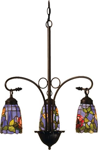 Three Light Chandelier Total: 24.5"H x 23"W Shade: 5.5"H x 4"W Bulb: Reg x3 Max Watt: 60 x3 Canopy & 3' of chain included. Free Shipping on Tiffany Style Lamps Coral and Burgundy Roses with Spring Green leaves, enhance these delicate stained art glass shades created with hand cut glass and copper foil construction. The shades are suspended from the gracefully curving arms of a three light chandelier, hand finished in Mahogany Bronze. |