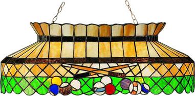 Oblong Light Total: 11"H x 32"L x 16"D Bulb: Reg x6 Max Watt: 100 x6 Canopy & two 3' sections of chain included. Free Shipping on Tiffany Style Lamps Rack em up! This oblong billiard pendant features a stained glass shade with crossed pool cue sticks, stripes, solids and a cue ball on a Honey Beige shade with Root Beer accents and a Green skirt. The hardware is hand finished in Mahogany Bronze. |