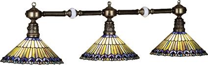 | Jeweled Peacock Three Light Bar Total: 36"H x 45"L x 12"D Shade: 6"H x 12"W Bulb: Reg x3 Max Watt: 100 x3 Canopy & three 3' sections of chain included. Free Shipping on Tiffany Style Lamps Glowing Amethyst jewels circle stylized peacock feathers made of Amber, Jade and Amethyst streaked Plum colored art glass with Cobalt and Plum accents. Each piece of stained glass in this Tiffany style shade is hand cut and wrapped in copper foil. This versatile favorite is a match to many decorative styles. The three light island hardware is hand painted in a beautiful Mahogany Bronze finish. |