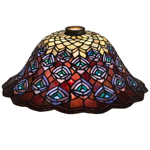 | As distinctive as a beautiful Peacock's feathers; no two shades will ever be the same as their individuality can be as remarkably unique as their personality. This artistic creation utilizes swirling opalescent art glass background combinations including Beige Amber; Yellow Pinks; Red Purples; Golden Blues and Greens; Ivories; Bluish Whites; Turquoise Blues; Periwinkle; Olive and Spring Greens; Pale Yellow; Amethyst; Emerald and Topaz. The eye of the plumage design reveals Purples; Pastel Blues; Teals; Cobalt and Ivories. Individual pieces of glass are hand cut and wrapped using Meyda Tiffany's famous copperfoil construction. Each shade is a unique work of art with color variations based on natural ingredients inherent in the glass. Meyda Tiffany Tiffany Peacock Feather Replacement Part 14475 |