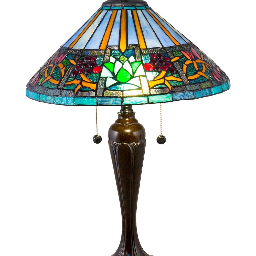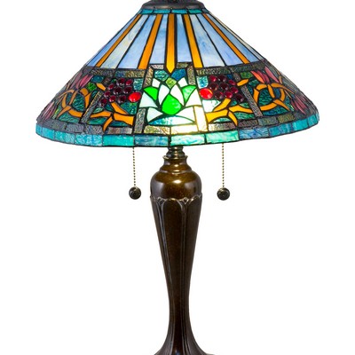 | Our dynamic Amada Tiffany Table Lamp will make a eye-catching style look in any room. The conical shade features a background of alternating azure blue and amber wedge shaped panels near the top. A wide horizontal band just below features a wandering vine in matching amber that is dotted with clusters of art glass ‘berries”. Large insets at intervals around the shades circumference feature serene lotus blossoms in green and white with a bottom border of iridescent green-blue. The tapered metal base is gorgeously textured and finished in rich Fieldstone. A matching flame finial and vase cap tops the fixture and adds balance to the overall style. Our Amada Tiffany Table Lamp will add a vivid pop of saturated color to bedrooms, dens or offices.Dale Tiffany Table Lamp Bulb Type: Med Base - E26 Bulb Qty (not included): 2 Bulb Wattage: 75W Shade Material: Hand Rolled Art Glass (Tiffany) Base Material: Metal Pull Chain OnOff Switch |