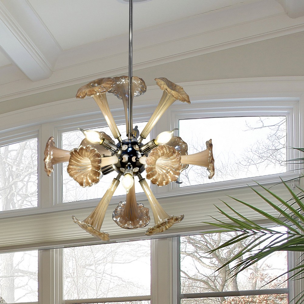 | Our Yuri 6 LT Hanging Pendant is a modern classic that will grace any decor in your home. The fixture features a series of 6 Favrile art glass shades in warm amber tones. Each is hand blown in a generously sized floral shape infused with bright amber tones that will cast a warm glow about the room when the pendant is illuminated. The shades are set satellite style on a metal base that is finished in lustrous polished chrome. Yuri hangs from a metal ceiling canopy, wire cable/chain and center support tube that are finished to match in Polished Chrome. A impressive topper to a large dining area, our Yuri 6 LT Hanging Pendant also makes a grand fixture in foyers and entryways with higher ceilings.Dale Tiffany Chandelier Bulb Type: Candelabra - E12 Bulb Qty (not included): 6 Bulb Wattage: 60W Shade Material: Hand Blown Art Glass Base Material: Metal Not Applicable OnOff Switch Chandeliers |