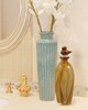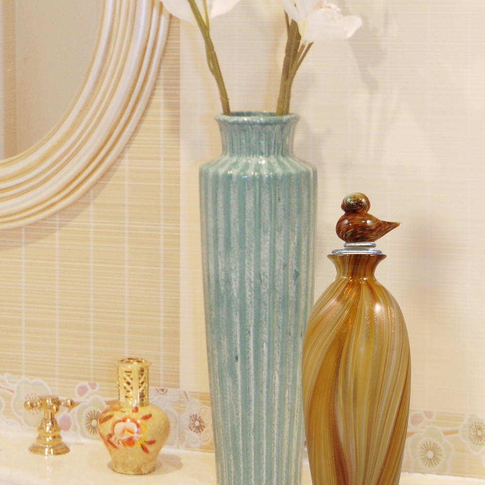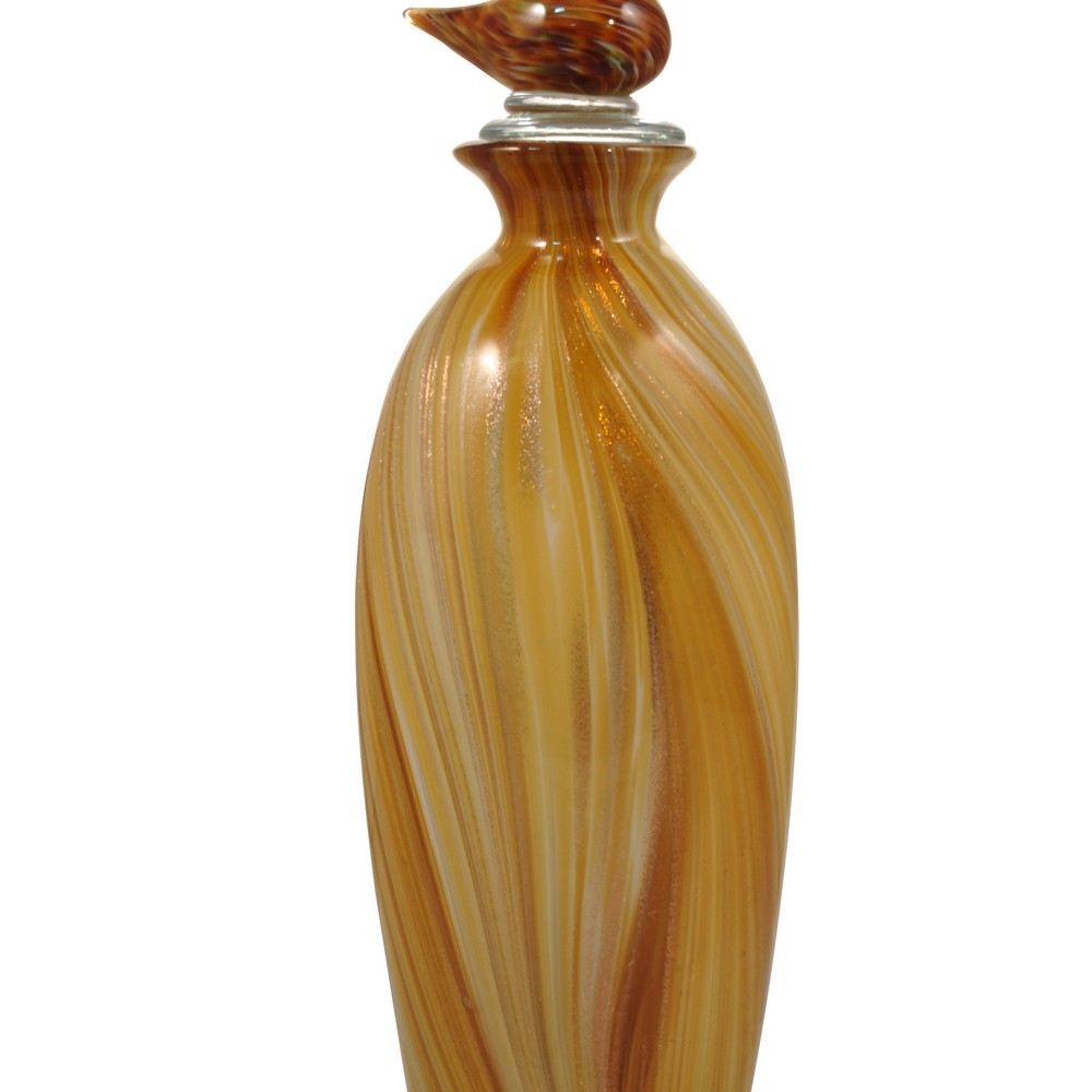 | Always at the forefront of home style trends, Dale Tiffany is pleased to present our Favrile Art Glass Collection Home Accents. The collection features an array of one of kind items that are a superb blend of form and function that will easily enhance any decor style. softly gorgeous, this Tall Wheat Vases sleek lines and superior craftsmansgroovy will command attention in any room in which it is displayed. The elongated bottle style vase is adorned with graceful brush strokes of amber, cream, brown, tan and glitter swirled together to make the impression of wheat stalks swaying in a gentle summer breeze. The bottle tapers, then flares at the neck and is topped by a stopper with a cgroovyper bird in matching colors. A lovely centerpiece on a dining table, console or entryway table, our Tall Wheat Vase also makes the ideal bridal or housewarming gift.