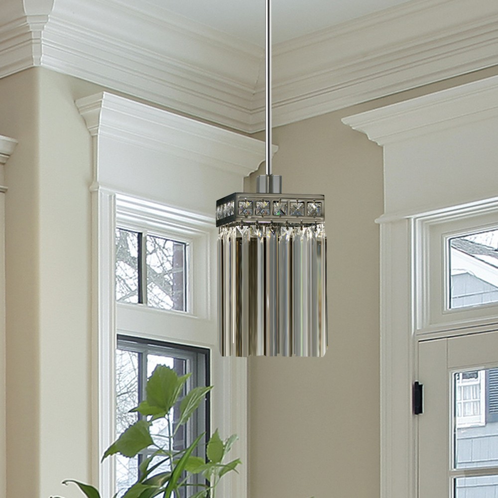 | Our impressive Bradford Crystal Mini Pendant is a modern classic that will highlight any decor in your home well into the 21st Century and beyond. The lovely square shade begins with a metal framework at the top that is finished in glistening Polished Chrome. A row of 5 faceted crystal jewels runs along the top of each of the 4 sides. Just below, hangs a row of 6 elongated crystal spikes that wrap around the light fixture within to make the body of the shade. Each spike hangs freely to make movement and a shower of sparkles from the 60W bulb (bulb not included) when the pendant is illuminated. Bradford hangs gracefully from a metal ceiling canopy and sleek metal tube, both finished to match the framework in sleek Polished Chrome. An ideal choice when hung in multiples over an exquisite bar, kitchen island or gaming table, our Bradford Crystal Mini Pendant will provide your family with a lifetime of exquisitely reliable lighting no matter where you choose to hang it. Dale Tiffany Pendant Bulb Type: Med Base - E26 Bulb Qty (not included): 1 Bulb Wattage: 60W Shade Material: Not Applicable Base Material: Crystal and Metal Not Applicable OnOff Switch Pendant Lighting |