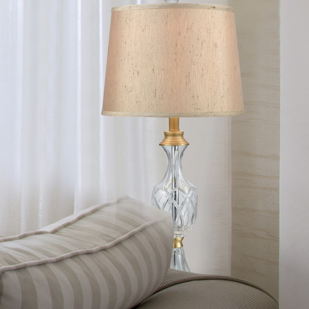 | The sumptuous combination of crystal and gold gives our Jeana 24% Lead Hand Cut Crystal Table Lamp its expensive look at a price that is easy on any budget. The center column features a large, round urn crafted in 24% lead crystal that is faceted in a crosshatch style that will catch the lamplight and reflect it outward into the room. Just below, a 24% lead crystal flange sits atop a square metal pedestal that is finished in burnished Golden Antique Brass. We topped Jeana with a matching metal vase cap and added a golden fabric shade and crystal finial to complete the look. Ideal in a formal living room or richly appointed bedroom, our Jeana Crystal Table Lamp will provide you with many years of exquisite lighting.Dale Tiffany Table Lamp Bulb Type: Med Base - E26 Bulb Qty (not included): 1 Bulb Wattage: 150W Shade Material: Fabric Base Material: 24% Lead Hand Cut Crystal and Metal Turn Knob 3-Way Switch Table Lamps |