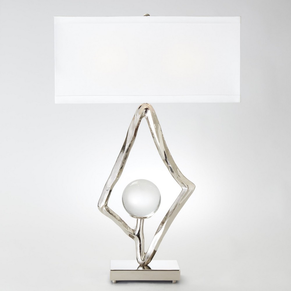 14.75"L x 6.25"W x 38.5"H Bottom Base 10"L x 6.25"W x 2.25"H Holds two 60W "A" bulbs 6' clear silver cord, switch on cord Rectangular hardback shade covered in ivory silk UL listed Nickel Dust with dry cloth, hand wash sphere The double-thread nature of the silk makes it elegant and durable. Slubs and irregu The inspiration for this stunning lamp was taken from a vintage pendant necklace. The uniquely shaped body of the lamp sits on a cool black iron base and is topped with a rectangular hardback shade covered in ivory silk. Exquisite on its own, but even better when paired with the included crystal ball. Kick up the glam a little more and pair it with the Jaguar on Crystal Ball to turn this piece into a truly striking showpiece! Jaguar on Crystal Ball sold separately. Available in two finishes: Brass and Nickel.