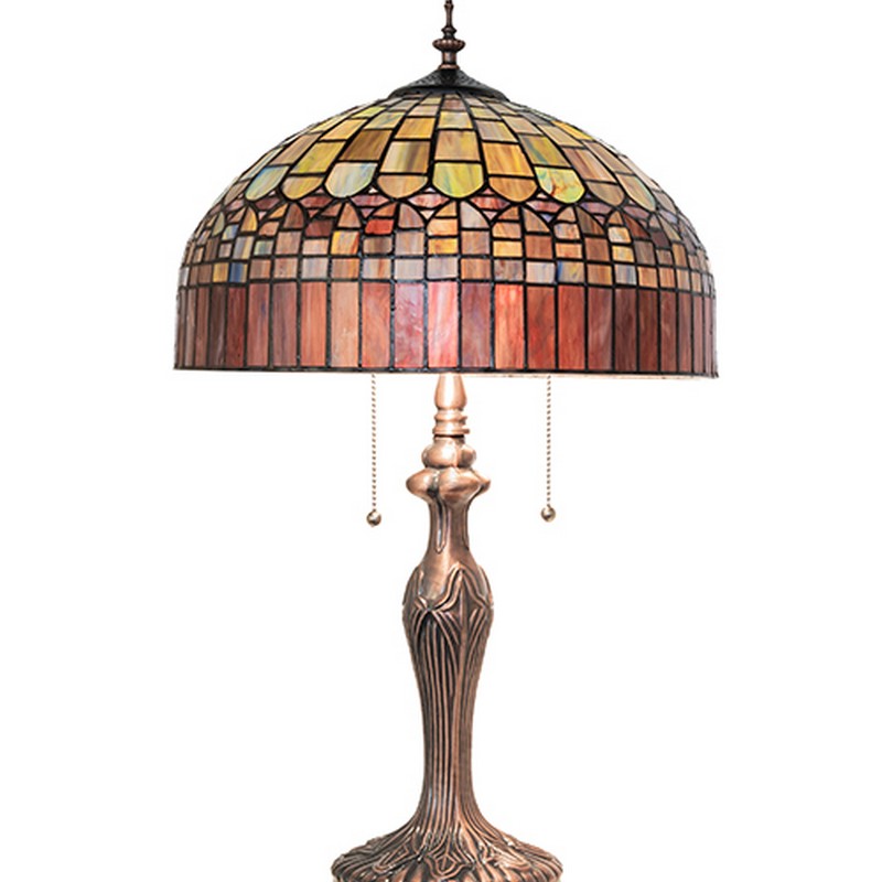 | Elegant and distinctive; this Tiffany Candice lamp design features a beautiful shade with Amber Plum glass fringe crowning domed brickwork of Emerald; Cobalt; and Ruby with Purple diamond-shaped accents for the look of woven fabric. The art glass shade is created using the famous Meyda copperfoil construction and complemented with an elegant cast metal base in a Mahogany Bronze finish. The lamp is ideal for illuminating tables and desks in homes; banks; and restaurants from Exeter; New Hampshire; to Billings; Montana; to Seattle; Washington. The Candice Table Lamp is included in our American-designed; Tiffany Reproduction Lighting Collection. UL & cUL listed for dry locations. Each shade is a unique work of art with color variations based on natural ingredients inherent in the glass. Copperfoil Table Lamps Table Lamps Meyda Tiffany Tiffany Candice Bulb Type: A19 Bulb Qty: 2 Bulb Wattage: 60 |