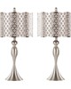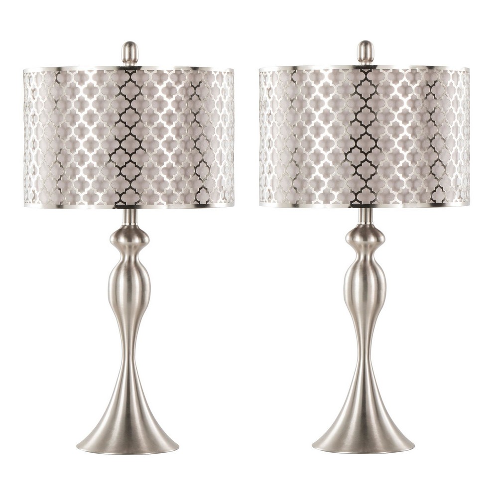 | Colors include: Brushed Nickel, Light Grey Linen, Metal Laser Cut Shade This sleek set of Ashland Table Lamps from Grandview Gallery by LumiSource cuts an eye-catching figure. With their curvaceous hourglass silhouettes, these lamps add sensuous class to any room. Each lamp is crowned by elegant double-layered shades and comes in a variety of colors, so you can pick a combination that suits your space the best. REQUIRES TWO (2) 100W BULBS, Bulbs included; Indoor use only, UL Listed, cUL Listed, Assembly required 14"L x 14"W x 27.25"H Shade To Floor Height: 16" Lamp Body Length: 7-7" Lamp Body Height: 15" Lamp Neck Height: 2" Shade Length: 14" Shade Width: 14" Shade Height: 9" Finial Height: 2" Harp/pole Height: 7.5" Cord Length: 66" Brushed nickel finish Laser cut drum shade with linen backing 3-way rotary switch Includes two table lamps Suitable for Living Room, Den, Bedroom, Office Item Weight: 5.5 Ships in 1 box(es) |