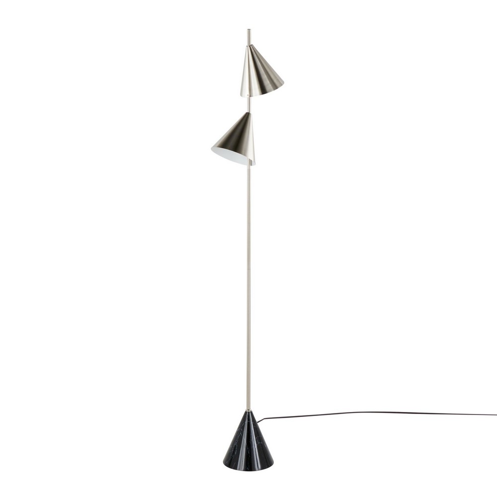 | Colors include: Plated Nickel, Black Faux Marble Add some contemporary design to your space with the Cone Metal Floor Lamp by LumiSource. This geometric lamp features two cone-shaped metal shades and a cone-shaped faux marble finish to its base. Pick a color that suits your home the best and illuminate your space with the Cone Floor Lamp today! REQUIRES TWO (2) 25W bulbs, LED Bulbs Included, Indoor use only, UL Listed, cUL Listed, Assembly required 12"L x 7.5"W x 65"H Shade To Floor Height: 44.5-54.5" Base Length: 8" Base Width: 8" Shade Length: 7" Shade Width: 7" Shade Height: 7.75" Cone shaped metal shades Faux marble base Plated nickel finish Foot pedal switch Suitable for Living Room, Den, Bedroom, Office Item Weight: 10.5 Ships in 1 box(es) |