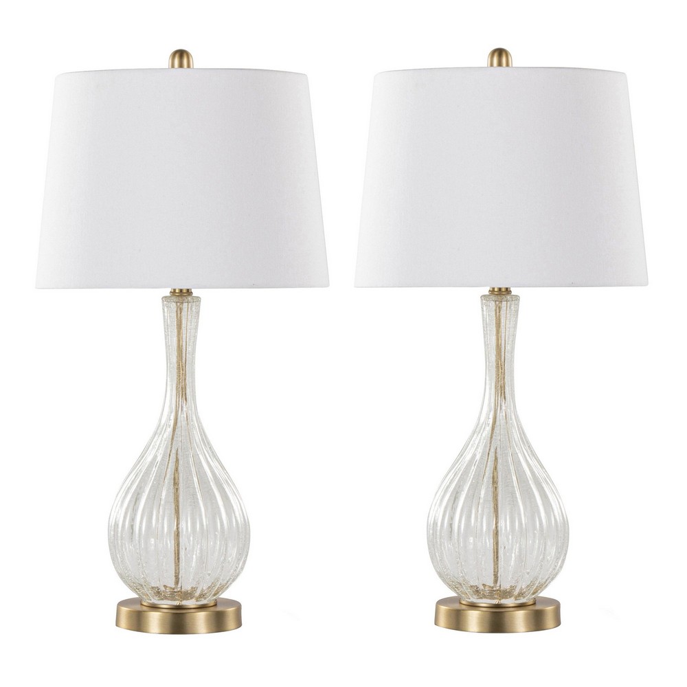 | Colors include: Clear Crackle Glass, Gold Metal, White Linen Illuminate your space with the Jenny Table Lamp from Grandview Gallery by LumiSource. This elegant lamp features a beautiful crackle glass body with metal accents and a tapered linen drum shade that is perfect for adding a designer look to a dull space. Whether it is in an entryway, living room, bedroom, or office this lamp is sure to brighten up your space. REQUIRES TWO (2) 100W BULBS, Bulbs included; Indoor use only, UL Listed, cUL Listed, Assembly required 14"L x 14"W x 27.25"H Shade to Floor Height: 16.5" Base Length: 6" Base Width: 6" Base Height: 1.25" Lamp Body Length: 7" Lamp Body Width: 7" Lamp Body Height: 15.75" Lamp Neck Height: 1.5" Shade Length: 14" Shade Width: 14" Tapered Shade Length: 12" Tap Tapered white linen drum shade Sleek gold plated hardware 3-way rotary switch Includes two table lamps Suitable for Living Room, Den, Bedroom, Office Item Weight: 6 Ships in 1 box(es) |