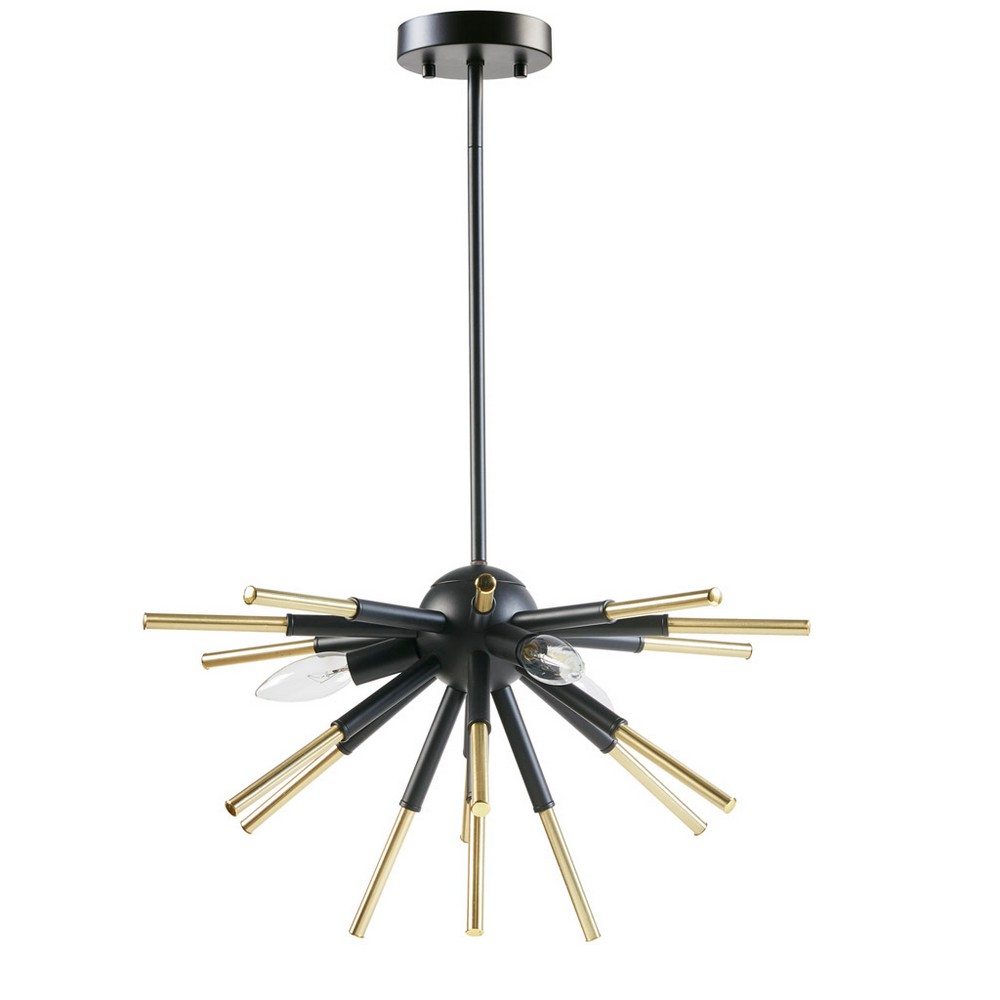 | Ink+ivy See below 1 Chandelier: 18" Dia x 17"H-53" H Socket Size: 1" Dia x 2"H Canopy Pendants: 4.75" Dia x 1" H Hanging Method Size: Rod 42" 90% Iron, 10% Wire Modern/Contemporary Style Includes 1 Piece(s) Spot clean only; Handle with care Bold and modern, the INK+IVY Ely 3-Light Spiked Chandelier brings an eye-catching addition to your home. Flaunting a two tone matte black and gold finish, this chandelier has a unique modern geometric design, for an artistic look. Also included are 4 extension rods, 3 measuring 12" and 1 measuring 6", which allow the light fixture to be mounted either 2 different semi-flush ways to the ceiling or 5 different ways as a hanging chandelier. The rods adjust between 6" - 42" to bring the maximum hanging height to 53" for the perfect fit in your dining room, kitchen, entryway, or living room. For indoor use only, this modern farmhouse style chandelier is not compatible with a slope ceiling and must be hardwired to the ceiling. Professional installation is recommended and mounting hardware is included. Dimmable with compatible dimmer switch and bulb (not included). Uses 3 Type B light bulbs (not included). |