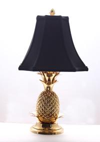 | This beautiful pineapple brass table lamp is 20 inches in height, made from a solid brass casting with a brass finish, it includes an 11" Black Silk Gold Lined Shade. The leaves of the pineapple gently unfold toward the bottom of the shade and are offset by a charming finial at the top. Completing the overall appearance is the sturdy yet graceful base that compliments the other features of the lamp. |