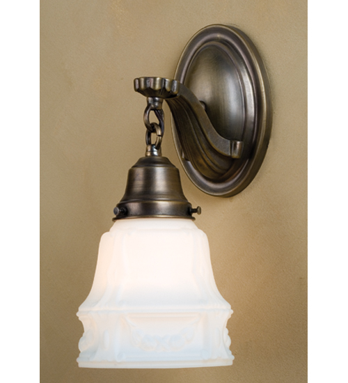 | This elegant Hartford one light wall sconce is crafted from brass in the USA by Meyda artisans. The fixture is hand finished in Antique Brass and has an ornamented etched opal glass shade. Total:11h. Bulb: Med Max Watt: 60 Custom Crafted In Yorkville, New York Please Allow 30 Days for delivery. |