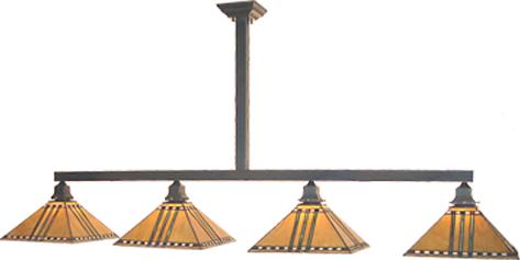 | With their love of geometric forms, architects of the Prairie School interpret organic objects into simplified lines. The Meyda Tiffany Prairie Corn four light pendant shades have rows of Chili Red and Wheat kernels and stalks of Bronzed Jade against a Maize Gold background. The stained glass shades are paired with simple Mission style hardware in a Mahogany Bronze finish. Total:37.5in. H. Bulb: Medx4 Max Watt: 100x4 |