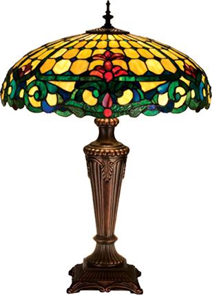 | Emerald green scrolls and sea blue accents on warm ivory make this Duffner and Kimberly reproduction a real beauty. Mahogany Bronze Base TOTAL:25H. SHADE: 7Hx18W BULB: MEDx3 MAX WATT: 60x3 |