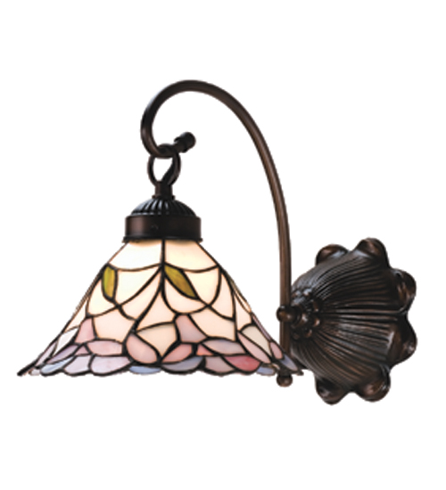 | Delicate plum pink flowers and tiny leaves on this bell shaped wall sconce. TOTAL:10H. SHADE: 10Hx6W BULB: MED MAX WATT: 60 |