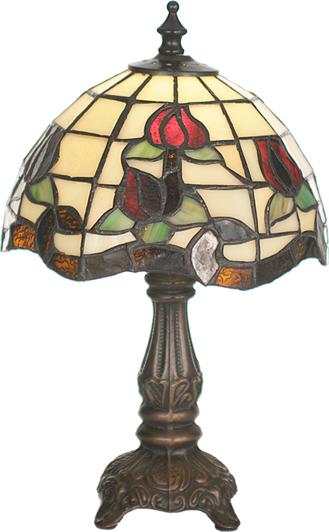 | Grace your home with this elegant shade, featuring a gridwork of Bone Beige glass, adorned with a Rootbeer granite border of swirling ribbons and perfect Burgundy rosebuds. The Tiffany style stained mini lamp is made of hand cut and copperfoiled glass and is paired with a Mahogany Bronze, hand finished lamp base. Total Height: 11.5"