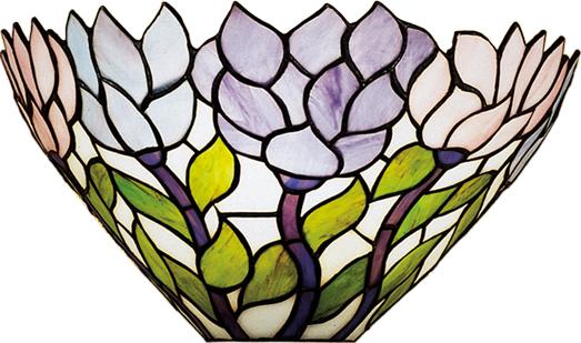 | Stylized Wisteria Flower Clusters Of China Pink, Grape And Amethyst Blue With Jade Green Leaves Drape Over This Ivory Toned Graceful Copper Foil WallSconce Shade. The Classic Styling Of This Tiffany Style Stained Glass Fixture And Soft Pastel Colors Will Add Charm To Any Room. TOTAL:7"H. SHADE: 7.5Hx14W BULB: MED MAX WATT: 60WT |