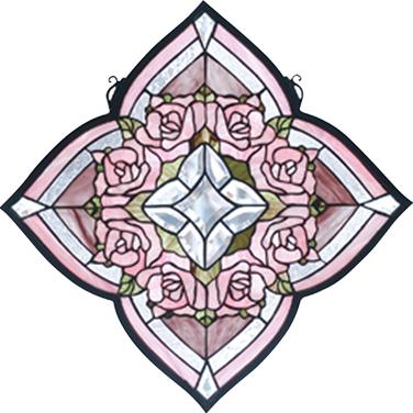 | A Victorian Inspired Ring Of Petal Pink Roses Are The Centerpiece Of This Quatrefoil Window Created With 188 Pieces Of Pink, Tender Green And TexturedClear Stained Glass With 13 Clear Glass Bevels. Handcrafted With Stained Art Glass Utilizing The Copperfoil Construction Process, This Beautiful Tiffany Style Window Also Comes With A Solid Brass Hanging Chain And Brackets. TOTAL: 20" H x 20" W |