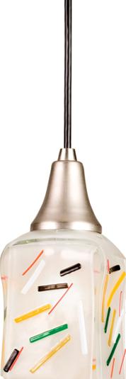 Yellow, Green Red, White and Black streamers are hot fused together and fired again to fall into a cube draped shape. Handmade by Meyda Craftsmen the shade with Brushed Nickel hardware and round black cord is muy caliente.